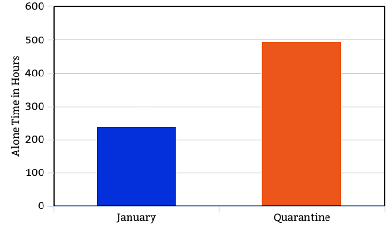 The first thing that is apparent is — Damn do we sleep a lot! But to give you something more to think about; the graph below is the alone time you had in the 31 days of January vs the 30 days of quarantine.